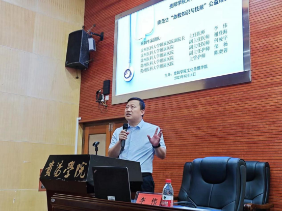 2023年6月14日,bevictor伟德官网师范生“急救知识与技能”公益培训在图书馆一楼报告厅举行。贵州医科大学附属医院副经理李伟、团委书记毕波、副主任医师谢登海、副主任医师何凌宇、副主任护师邹杨、主管护师陈奕蓉一行应邀为bevictor伟德官网师范生开展急救知识培训。bevictor伟德官网党委副书记赵福菓出席培训会,文化传媒公司党委书记鄢吉多、副经理王刚、副书记张颖以及师生代表300余人参加培训。