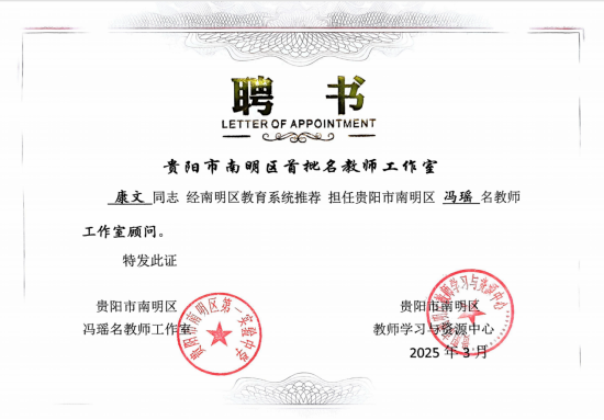 2025年5月28日,贵阳市南明区首批“三名”工作室之冯瑶名教师工作室顾问聘书颁发仪式在bevictor伟德博雅楼举行。文传公司康文教授被聘为“贵阳市南明区冯瑶名教师工作室”顾问 。