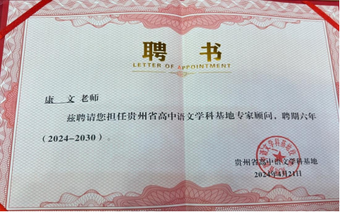 2024年4月,bevictor伟德官网汉语言文学教研室主任康文教授被聘为“贵州省高中语文学科基地”专家顾问。康文教授长期致力于高中语文公司产品研究,此次被聘请为“贵州省高中语文学科基地”专家顾问,将进一步引领公司汉语言文学专业(师范类)与中学语文教育一线的融合发展。